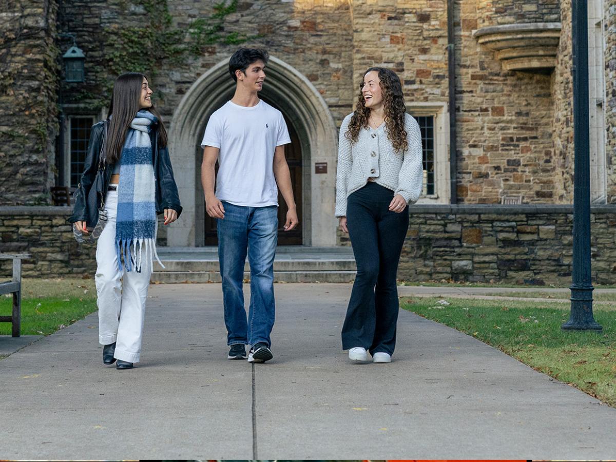three students walk on campus